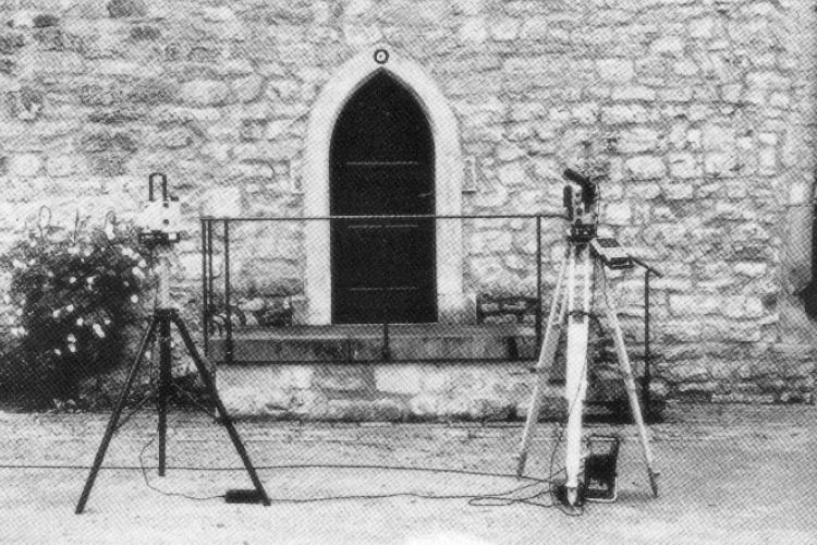 Geräteanordnung für Vorwärtseinschnitt. Links Lasertheodolit, rechts optischer Theodolit mit Aufsatzlaser.