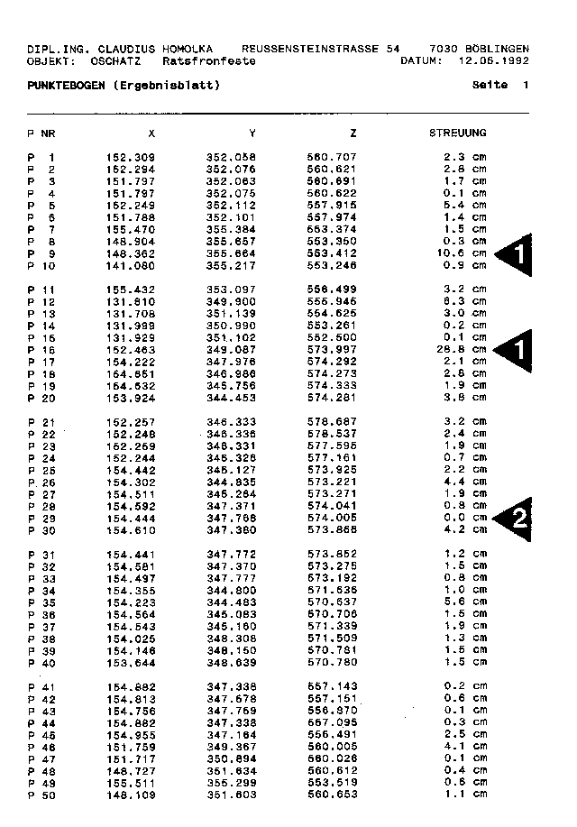 Oschatz, Amtsfronfeste. Koordinatenliste der ersten 50 Meßpunkte. In der rechten Spalte Angabe der Meßgenauigkeit. Ziffer "1": Fehlmessungen. Ziffer "2": Exakte Messung.
