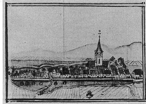 Eltingen im 17. Jh., Ansicht des Dorfes von Norden mit umschließender Ettermauer und dem dicht gestaffelten Kernbereich um die Pfarrkirche St. Michael. Aus den Ortsansichten des Andreas Kieser (1680-87).