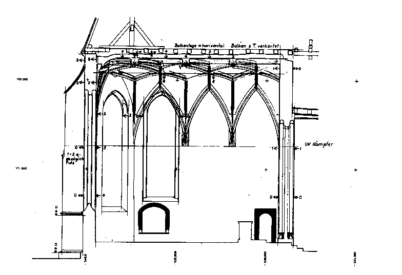 Längsschnitt nach Süden. Neigungs- und Setzungswerte (Angaben in cm).