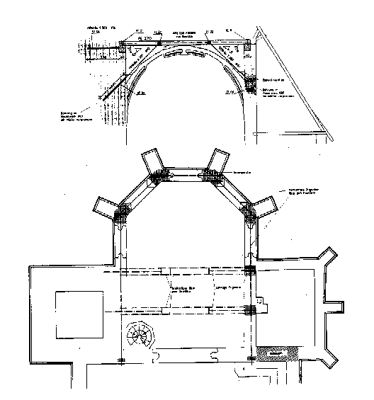 Grundriß und Querschnitt mit den geplanten Maßnahmen zur Gewölbesicherung (z. T. umgezeichnet nach Vorlage von E. Albrecht, Ingenieurbüro für Bauwesen).